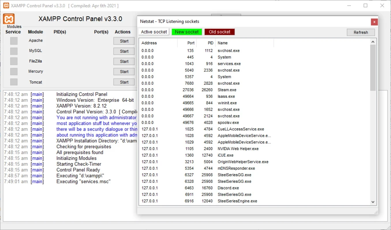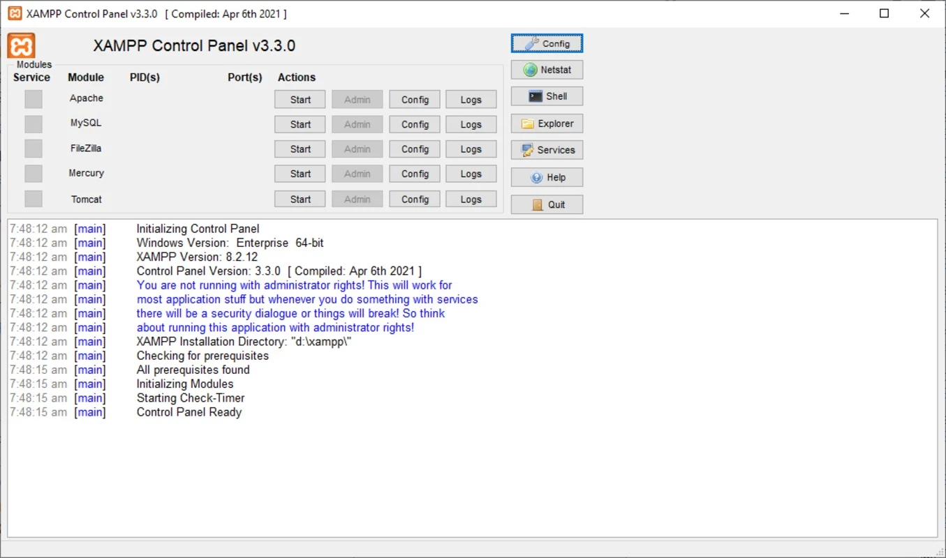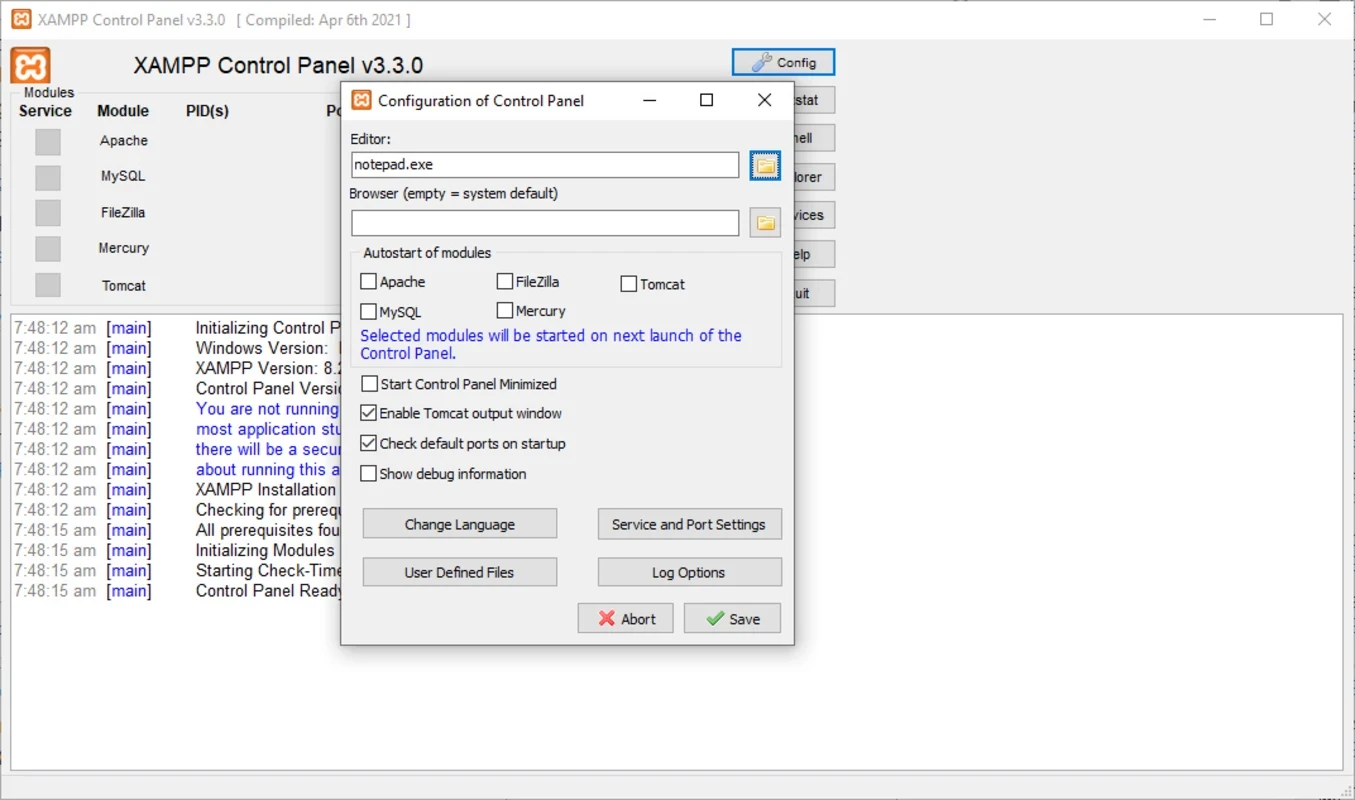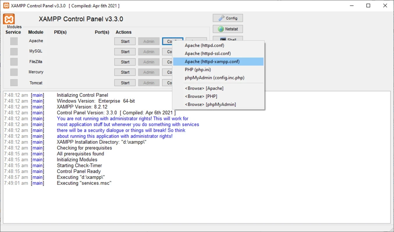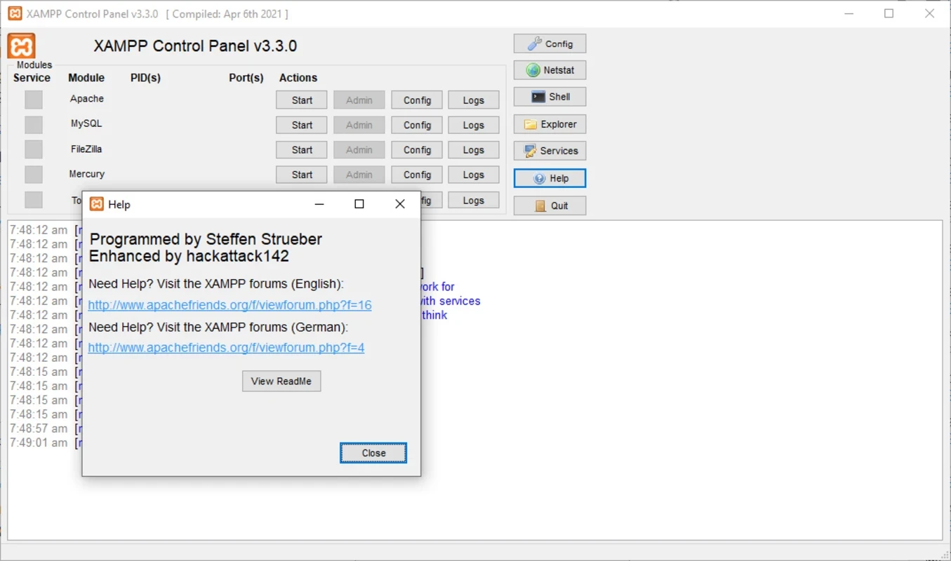 After installation, navigate to the Control Panel and click the ‘Start’ button. You are prompted to Module Control to start Apache and MySQL. You can access to dashboard while navigating to http://localhost with the help of a web browser like Google Chrome. Select the htdocs directory from the installation folder to save your web files, and manage your database while accessing phpMyAdmin through http//:localhost/phpmyadmin. Click on the ‘Stop’ option to stop the services from the Control Panel. The Control Panel contains the following important components;